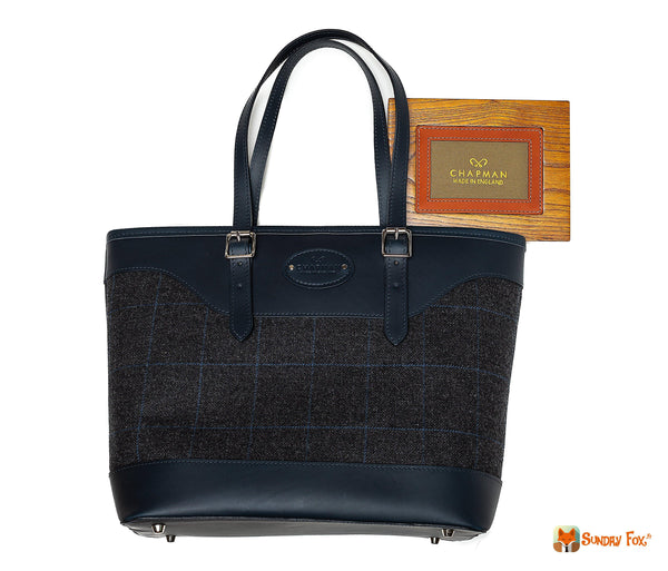 Ce magnifique sac à main style cabas en cuir bleu marine et tweed gris accompagnera vos tenues de ville et de campagnes tout au long des années.